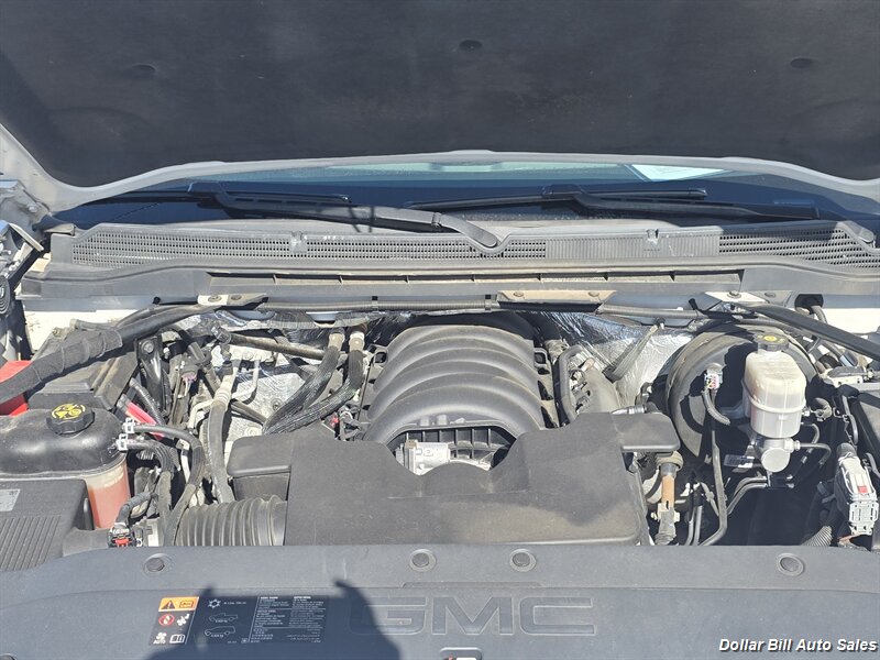 This 2015 GMC Sierra 1500 SLT is powered by the EcoTec3 5.3L V8 engine producing 355 hp and 383 lb-ft of torque. The engine features GM’s EcoTec3 technologies, including direct injection, variable valve timing and cylinder deactivation for a balance of power and efficiency. It is paired with a smooth-shifting 6-speed automatic transmission. EPA fuel economy is approximately 16 MPG city and 22 MPG highway.